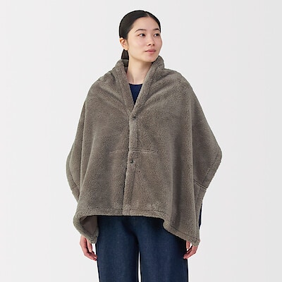 ボタンでとめて肩に掛けたり、そのままひざ掛けにしたり、畳んで背当てにしたりと屋内外問わず色々なシーンで活躍します。