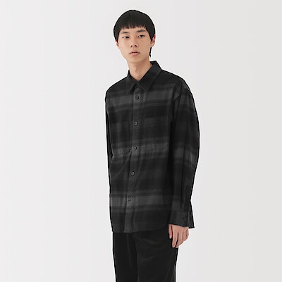 フランネルシャツジャケットは、胸のダブルポケットがポイントのゆとりのあるシルエットで羽織りとしても使用できます。