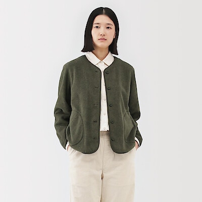 シャツにも合わせやすい襟なしデザインになっています。