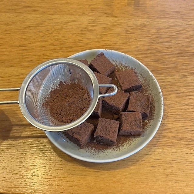 箱から出して、ナイフで切り分けて、ココアパウダーを茶こしでふりふりして・・・