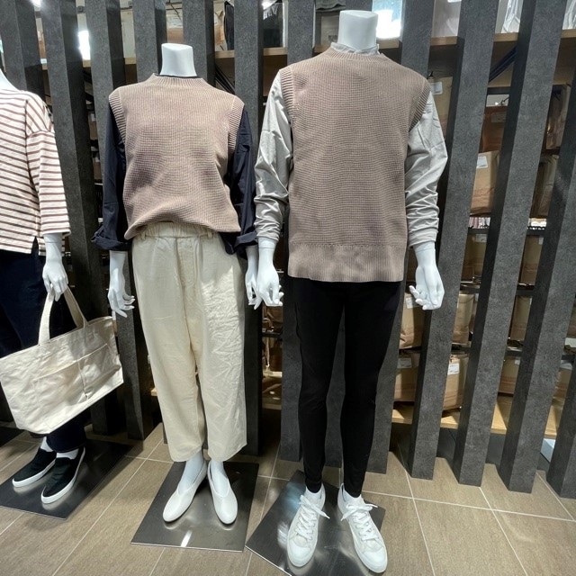 店頭では、このように紳士、婦人マネキンにリンクコーデで着せ付けてみました。