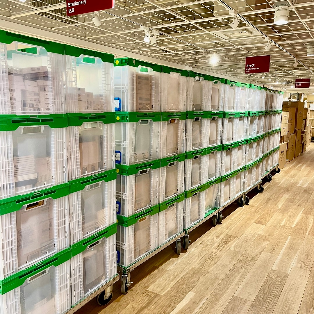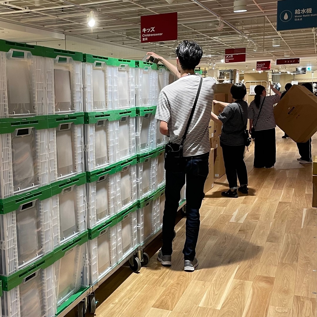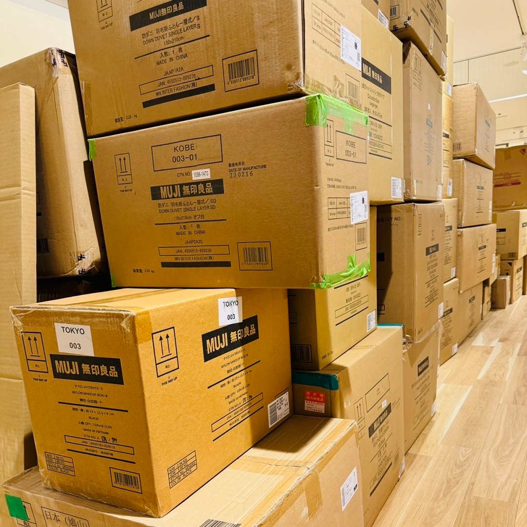 初めて入店した日から数日後、たくさんの商品たちが入荷しています。その数の多さに驚きつつ、各売り場に運んでいきます。