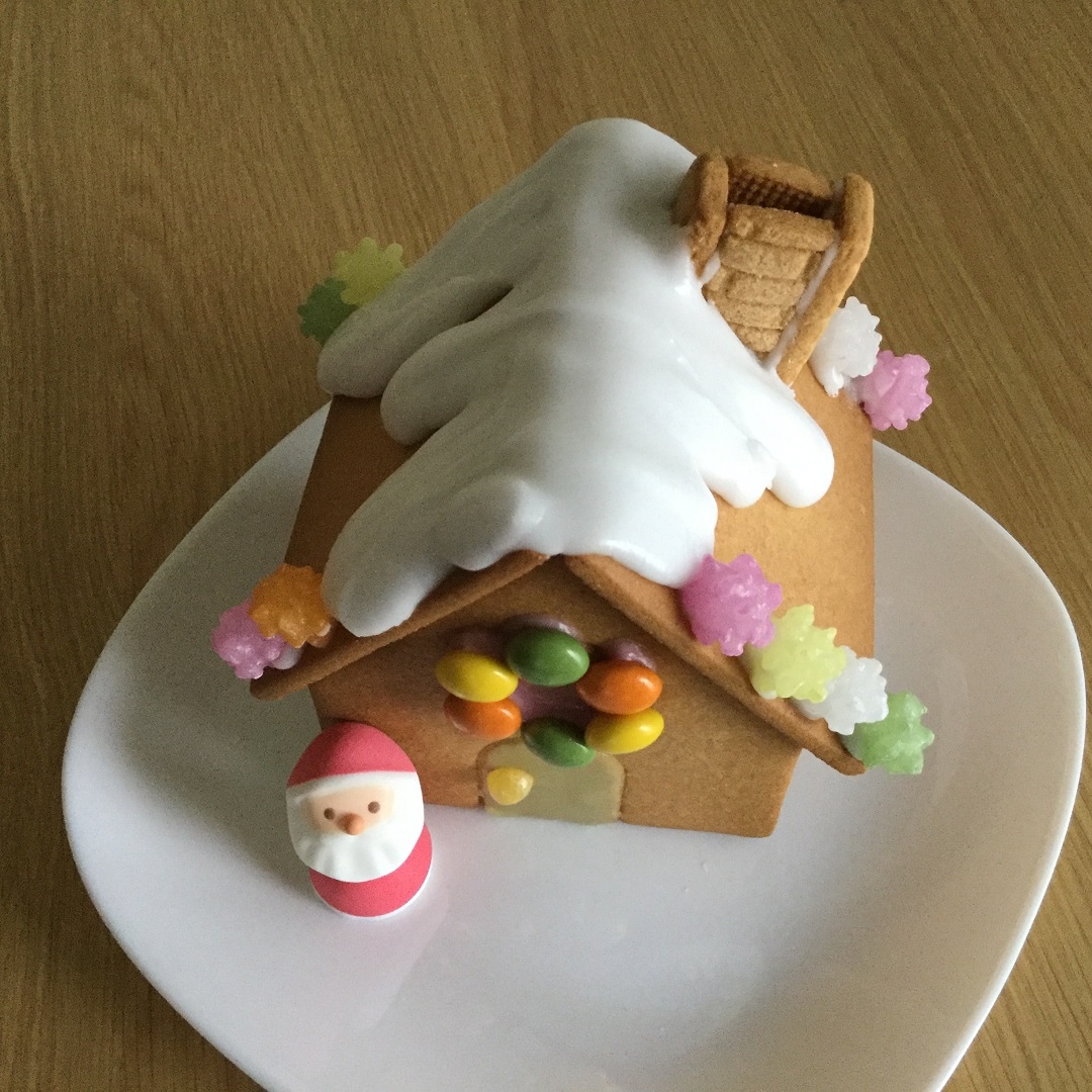 家が完成したらアイシングを使って屋根に雪をのせます。この時、アイシングは少し残しておきましょう。