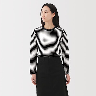 婦人 天竺編みクルーネック長袖Tシャツ 婦人XL・黒ボーダー