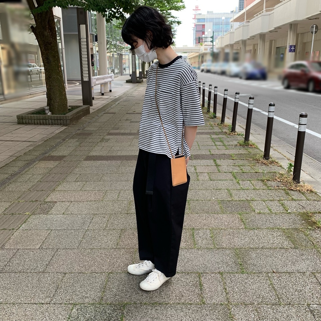 腕をカバーする五分袖と、体の線を拾いにくいワイドなシルエットが特徴的です。
