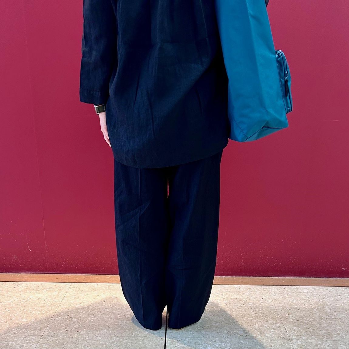 七分袖で1枚でもはおりでも使えるリネンブラウスに、ヘンプ混ストレートパンツを合わせました。色味を合わせセットアップのように着るのもおすすめです。