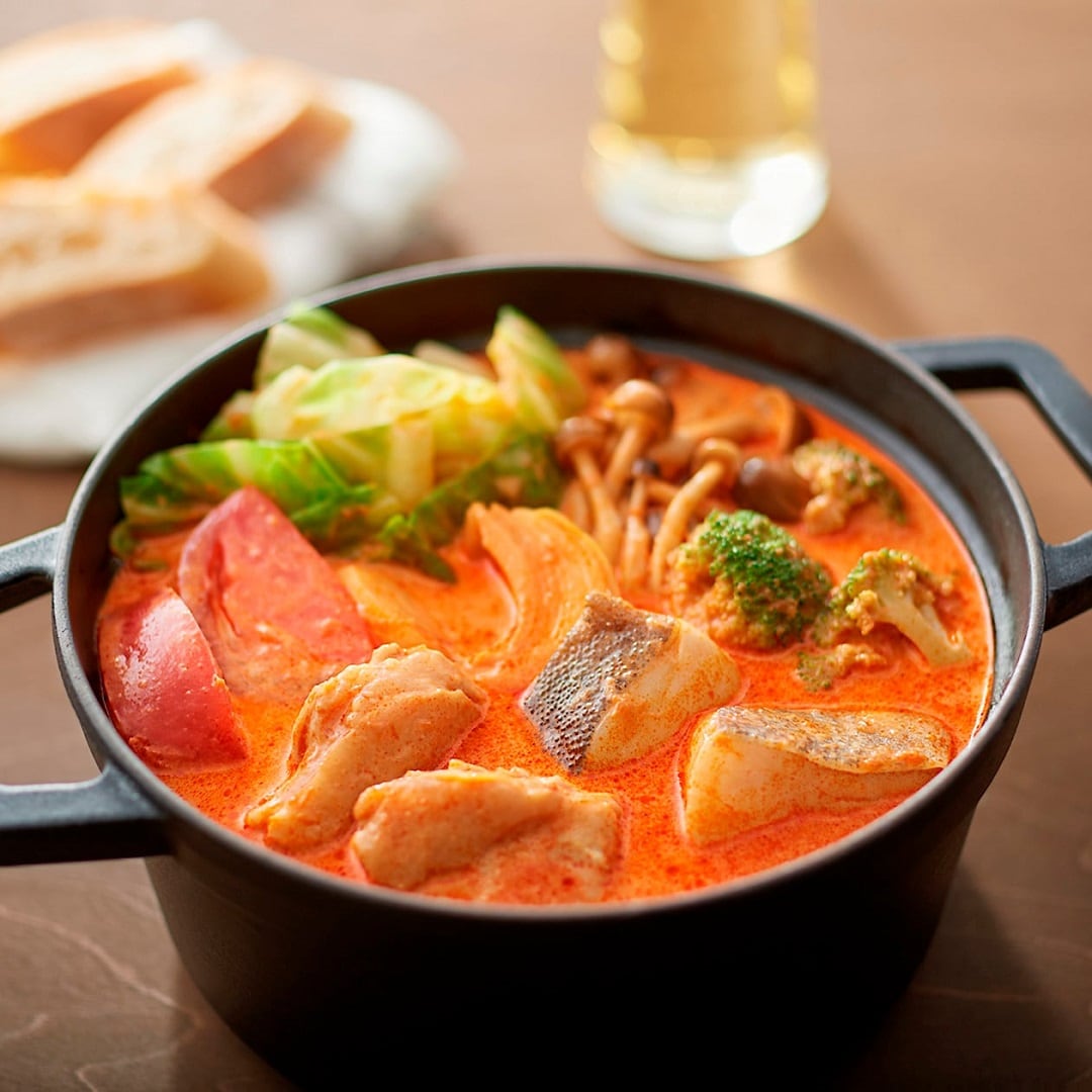 アメリケーヌソースの旨味と牛乳割のクリーミーな味わいが特長のビスク鍋は、ごはん+チーズでチーズリゾットにするのがおすすめです。
