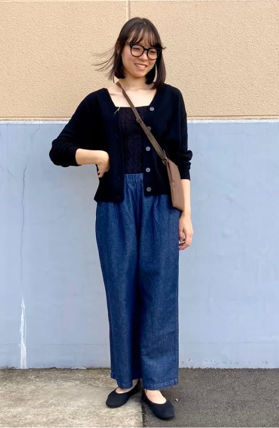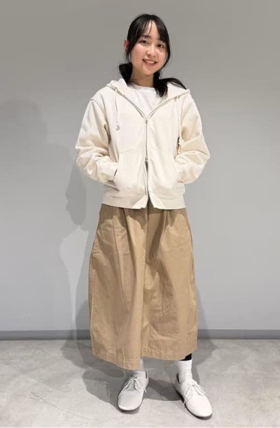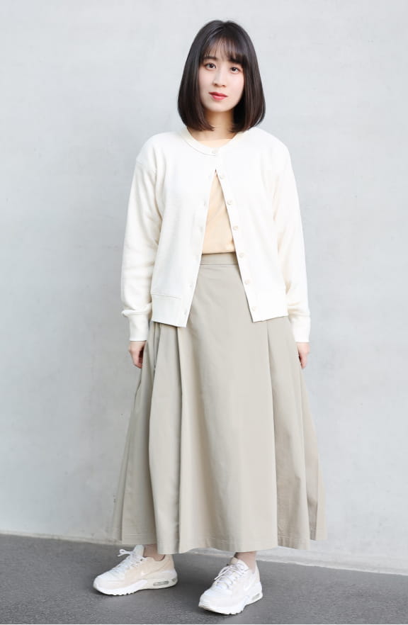 ゆったりとカーブを描くワイドシルエットのコクーンと、スカートのように見えるスカートパンツ