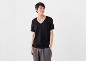 ベーシックなかたちのVネックのインナーです。襟ぐりのテープを薄くした、トップスに響きにくい仕様です。脇に縫い目を入れることにより、洗濯後によれにくくしています。