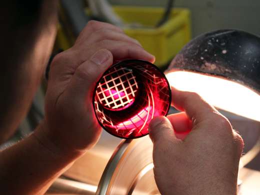 江戸切子は、透明硝子の上に色硝子を被せ、回転する円盤状のダイヤモンドの刃で削って、模様づけをします。薄い硝子を同じ深さで削っていくので繊細な力加減と技術が必要です。