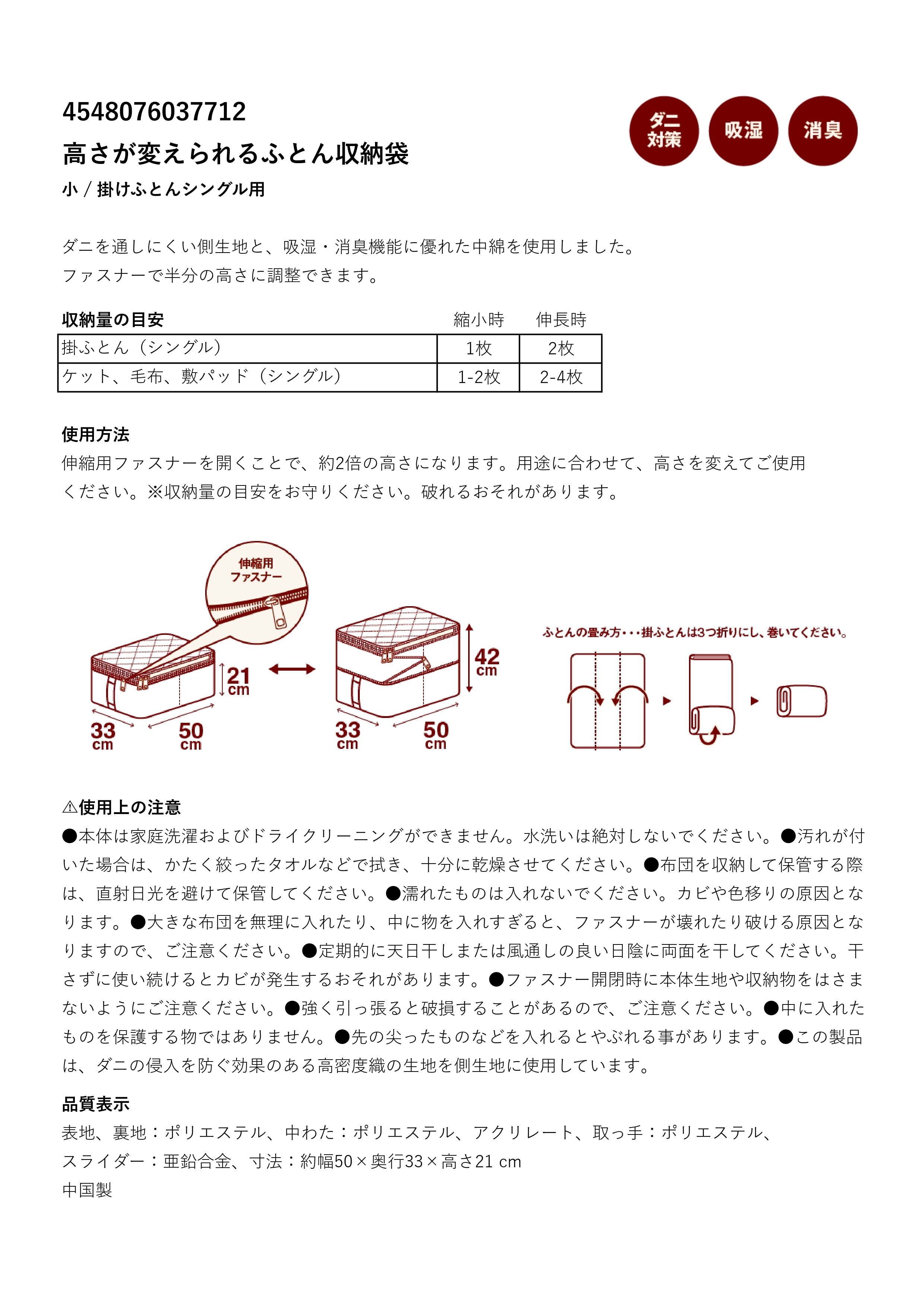 ダニを通しにくい側生地と、吸湿・消臭機能に優れた中綿を使用しました。ファスナーで半分の高さに調整できます。