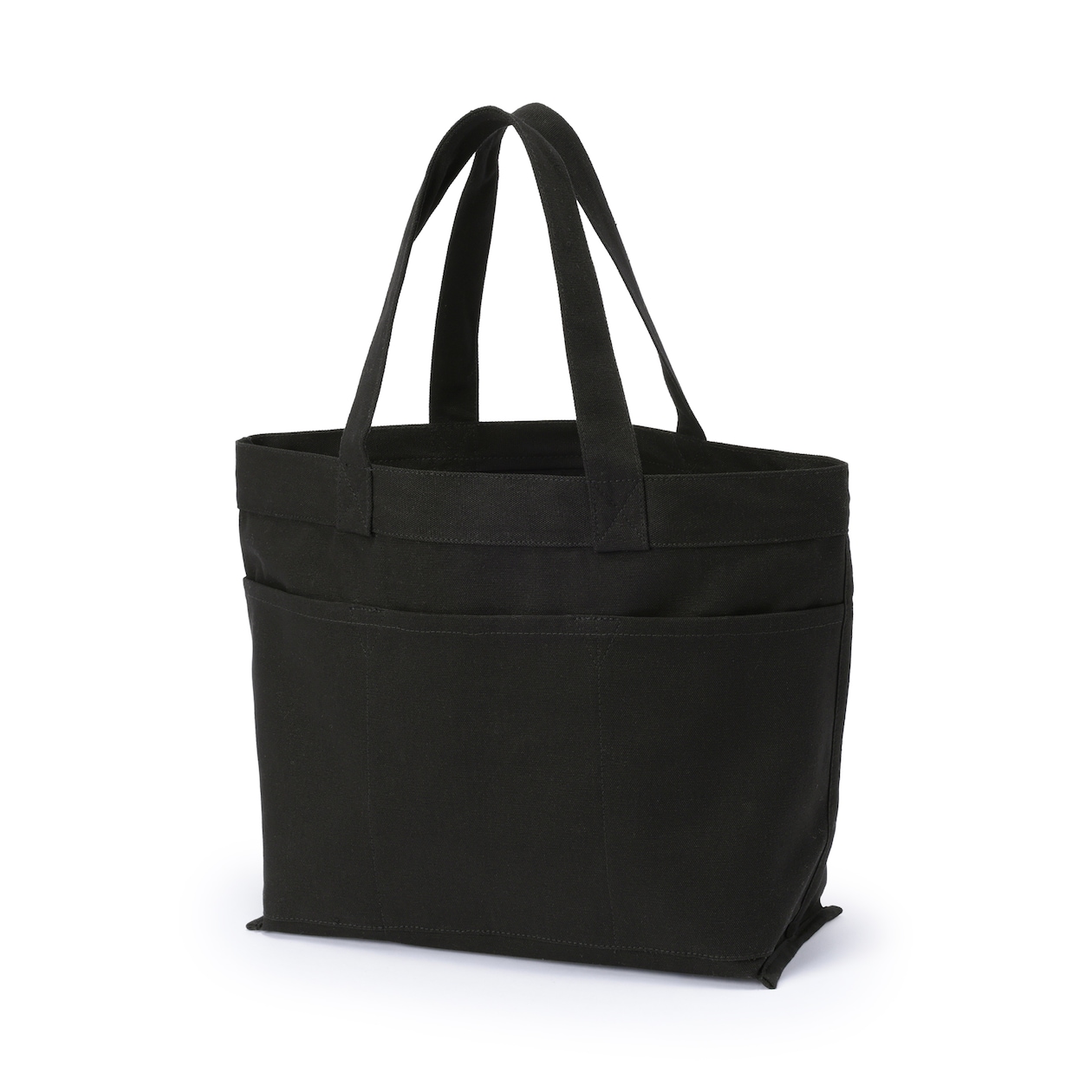 適度な厚みの帆布生地で横型のトートバッグを作りました。収納に便利な外ポケット付き。綿はオーガニックコットンです。