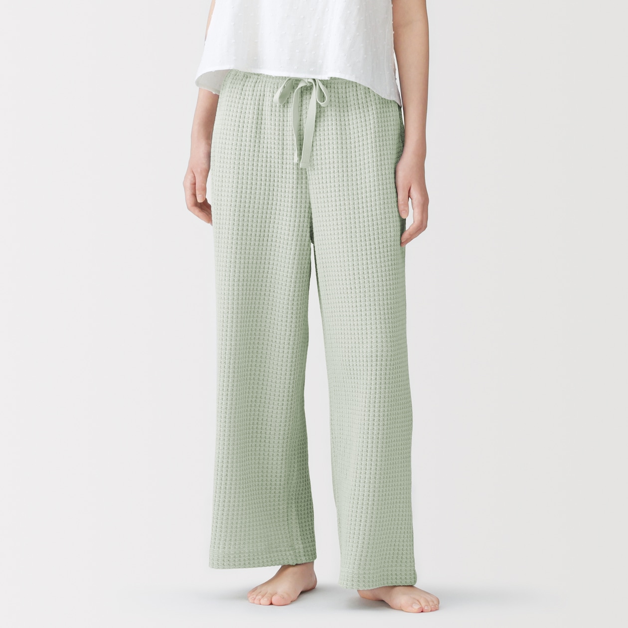 ざっくりと透かし編みで編まれたポケット付きのルームパンツです。綿はオーガニックコットンです。