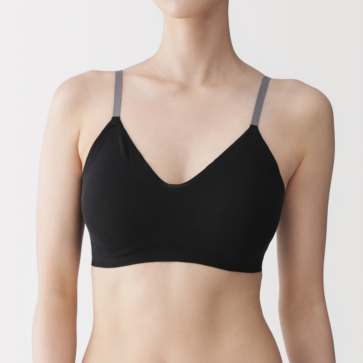 トレンド感のある綿混のリブ素材を使用した、カジュアルでおしゃれな雰囲気のブラジャーです。極力縫製をせず接着で仕上げた、肌あたりよく縫い目の凹凸がひびきにくい仕様です。