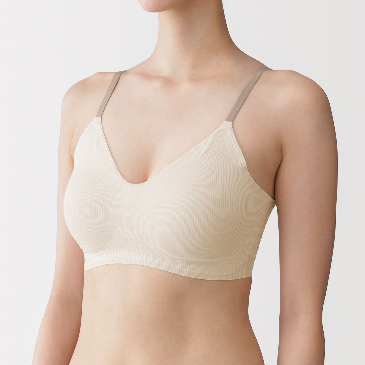 トレンド感のある綿混のリブ素材を使用した、カジュアルでおしゃれな雰囲気のブラジャーです。極力縫製をせず接着で仕上げた、肌あたりよく縫い目の凹凸がひびきにくい仕様です。