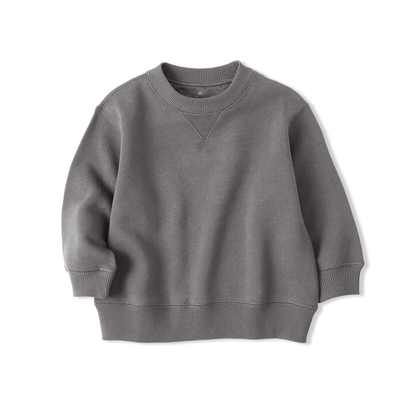 程よいゆとりがあり重ね着もしやすく、動きやすいシルエットに仕上げました。襟のV字のガゼットをリブ素材を使って縫い合わせることで、首元の伸縮性を高めています。大きなこどもの頭もするっと通せる服育仕様で、通常ある肩のスナップを開閉する動作がなく脱ぎ着が簡単。ひとりでのお着替えを応援します。