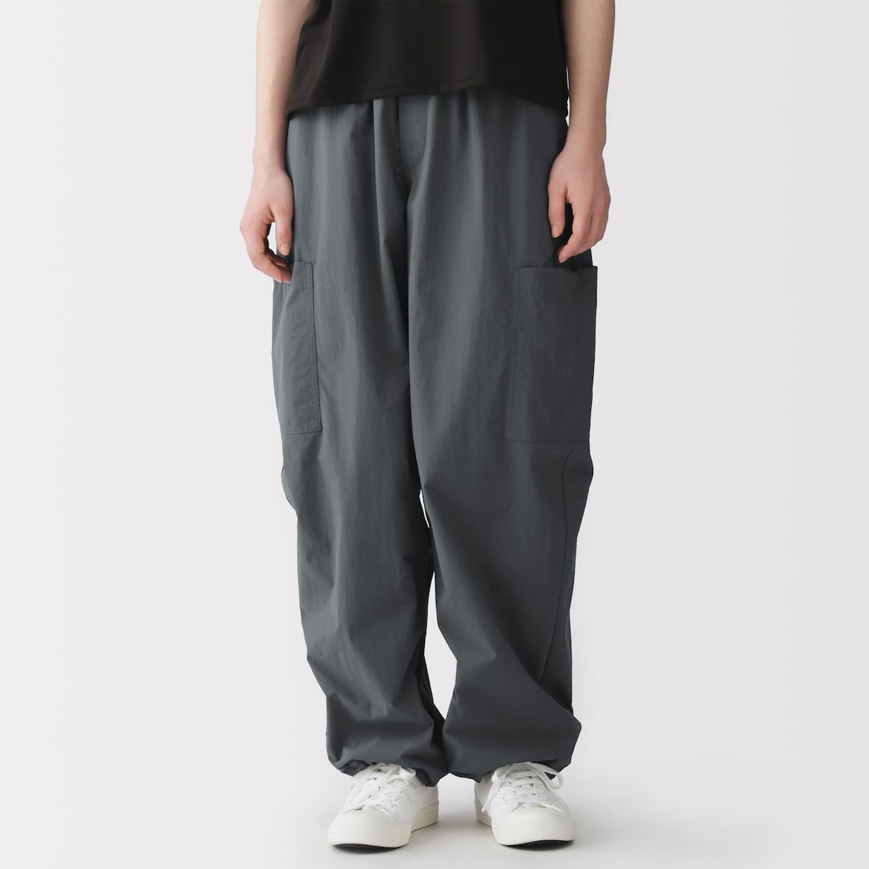 着こなしに合わせて裾幅を自由に調節できるゴム付きのパンツです。
