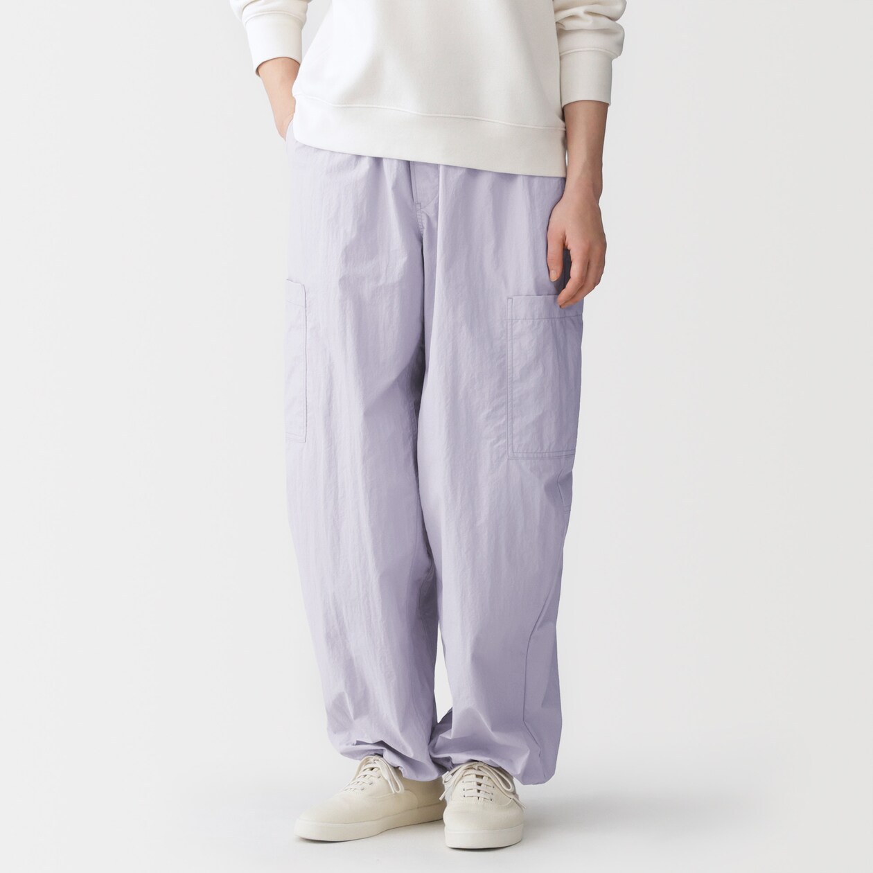 着こなしに合わせて裾幅を自由に調節できるゴム付きのパンツです。