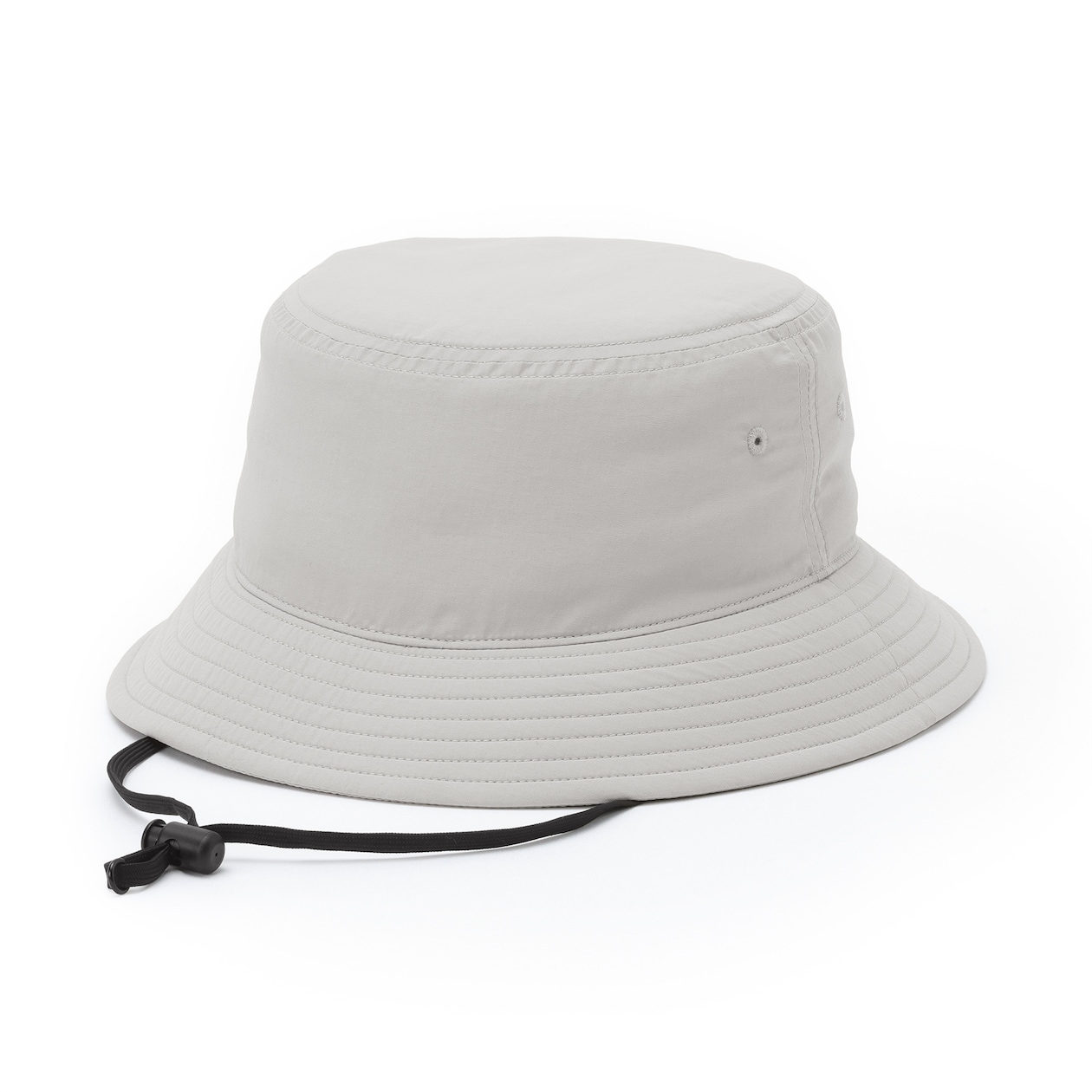 UVカット率90%以上、紫外線保護指標の最高値であるUPF50+の生地を使用しています。生地に撥水加工を施しました。内側のベルトでサイズ調整ができます。あご紐は取付部分を引っ張ると外れます。障害物に引っかかった際に外れる設計です。