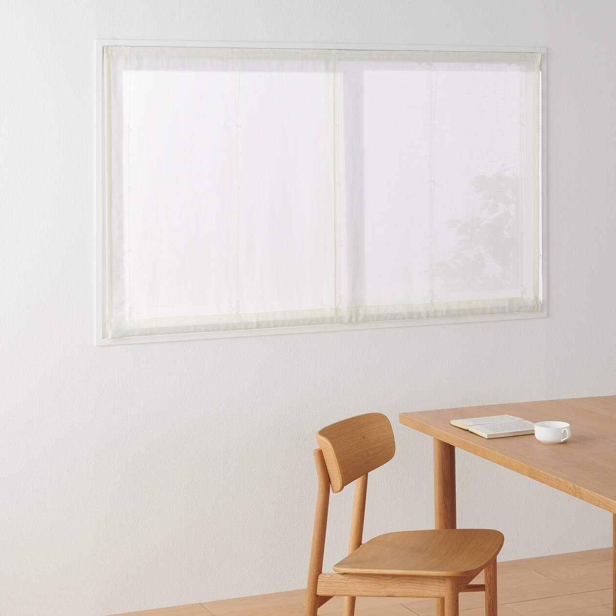 天然素材のような表情の生地に仕上げました。お手入れのしやすいポリエステルを使用しています。プレーンシェードの上部パーツセット部分には、防炎機能が付いていません。