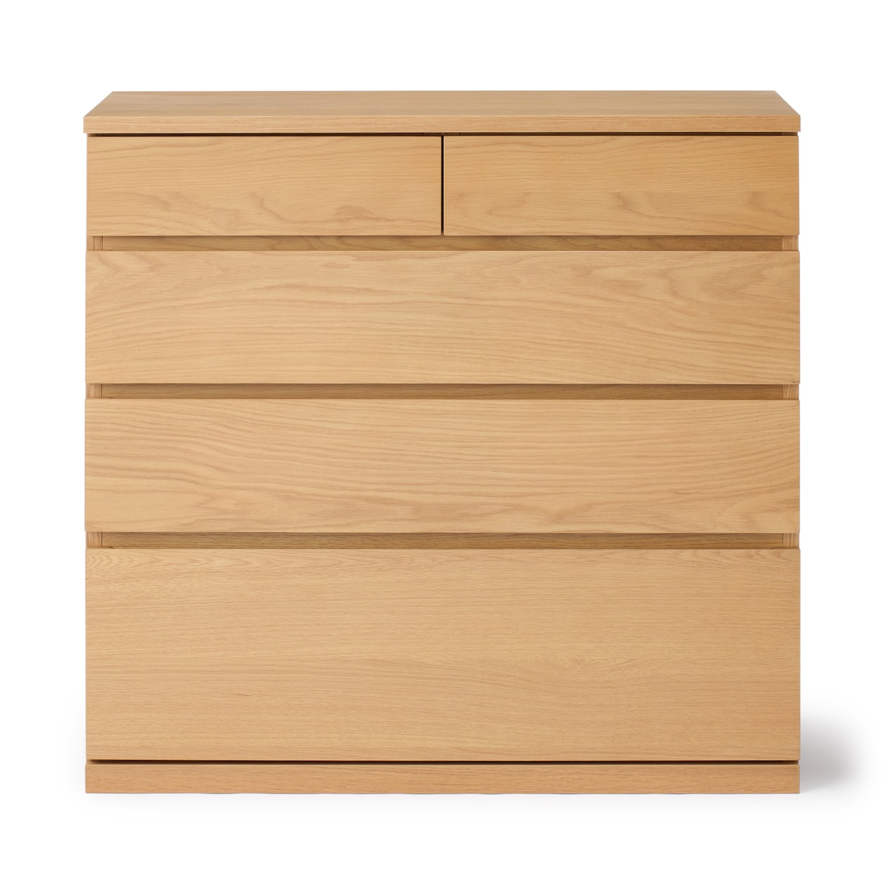 ベーシックなデザインの木製収納です。引出しの深さがそれぞれ違うので、大きさの違う衣服を用途別に収納することができます。浅い引出しには、仕切り板が3枚ついています。台輪式で、商品下にほこりがたまらず掃除が楽です。背板には、壁固定金具取付穴がございます。オーク材とウォールナット材がございます。※この商品には突板を使用しています。