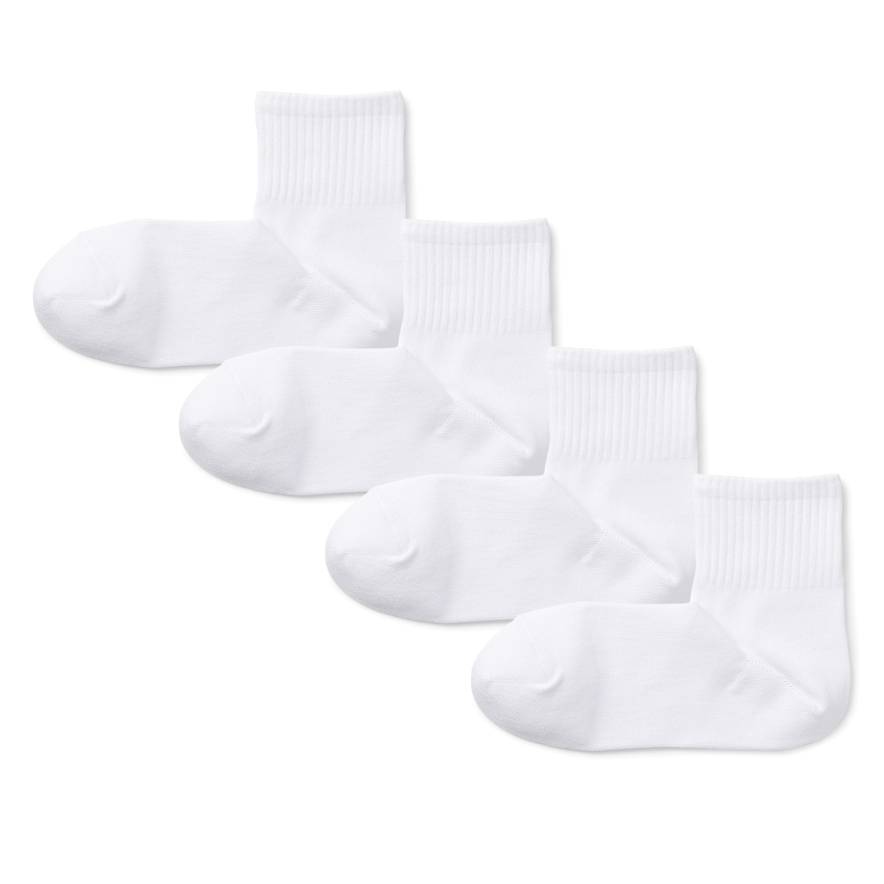 強めに撚りをかけた綿混素材を使用しています。少し生地が硬くざらりとした肌触りです。踵に合わせて直角に編みたてました。4足組にし包装を簡略化しました。4足とも同じ色なので、スクールソックスをお探しの方などにもおすすめです。