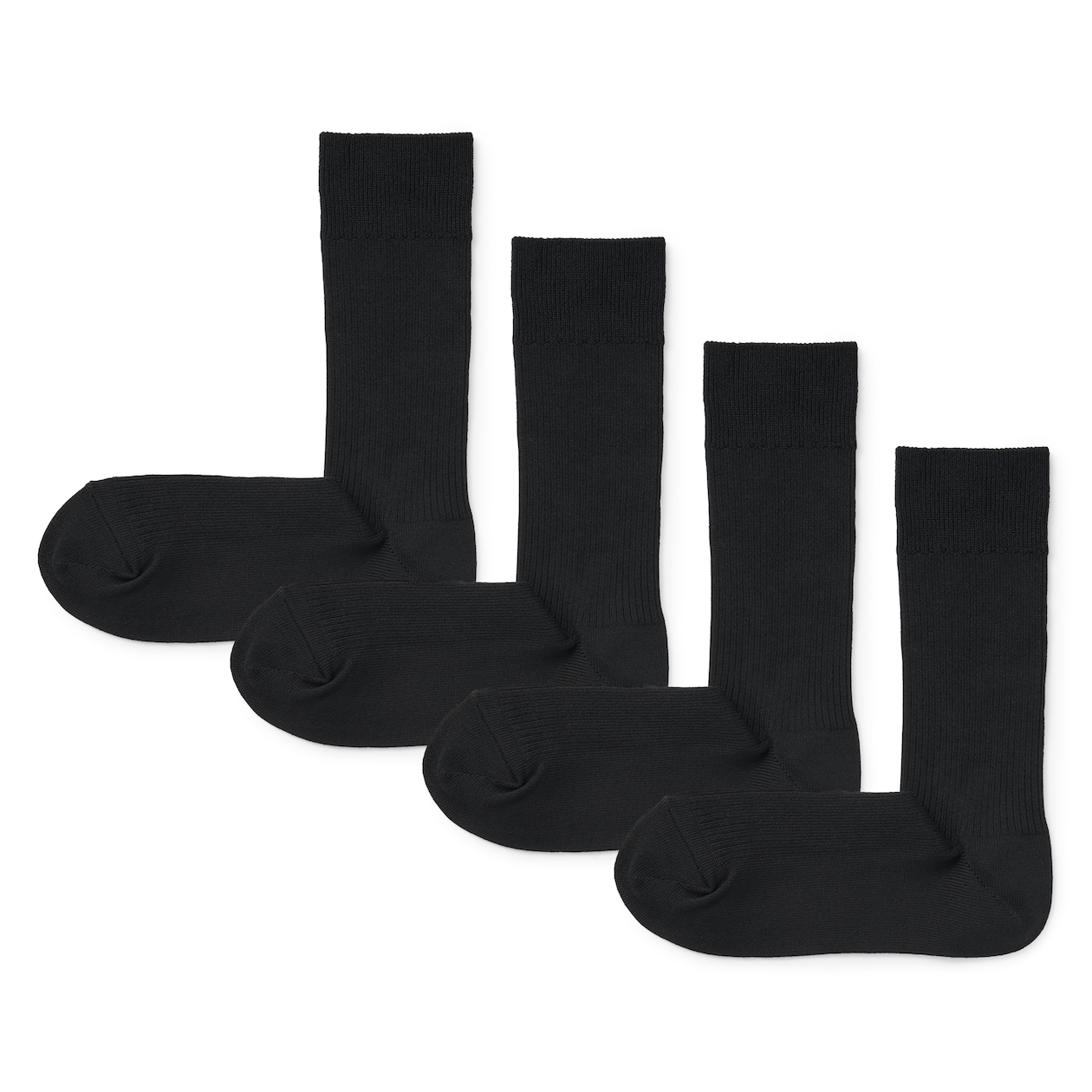 強めに撚りをかけた綿混素材を使用しています。少し生地が硬くざらりとした肌触りです。踵に合わせて直角に編みたてました。4足組にし包装を簡略化しました。4足とも同じ色なので、スクールソックスをお探しの方などにもおすすめです。