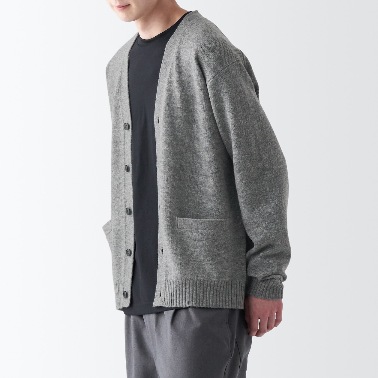 ウールの素材感を感じられるベーシックなフィットのVネックカーディガン。丈夫さとあたたかさを実現するために異番手引き揃え(太さの違う糸を撚り合わせて一本にしています)を行っています。 その結果、表面に凹凸ができることで空気の層ができてあたたかくなります。。前立て部分はシングル総針仕様にすることですっきり見えるようにしています。