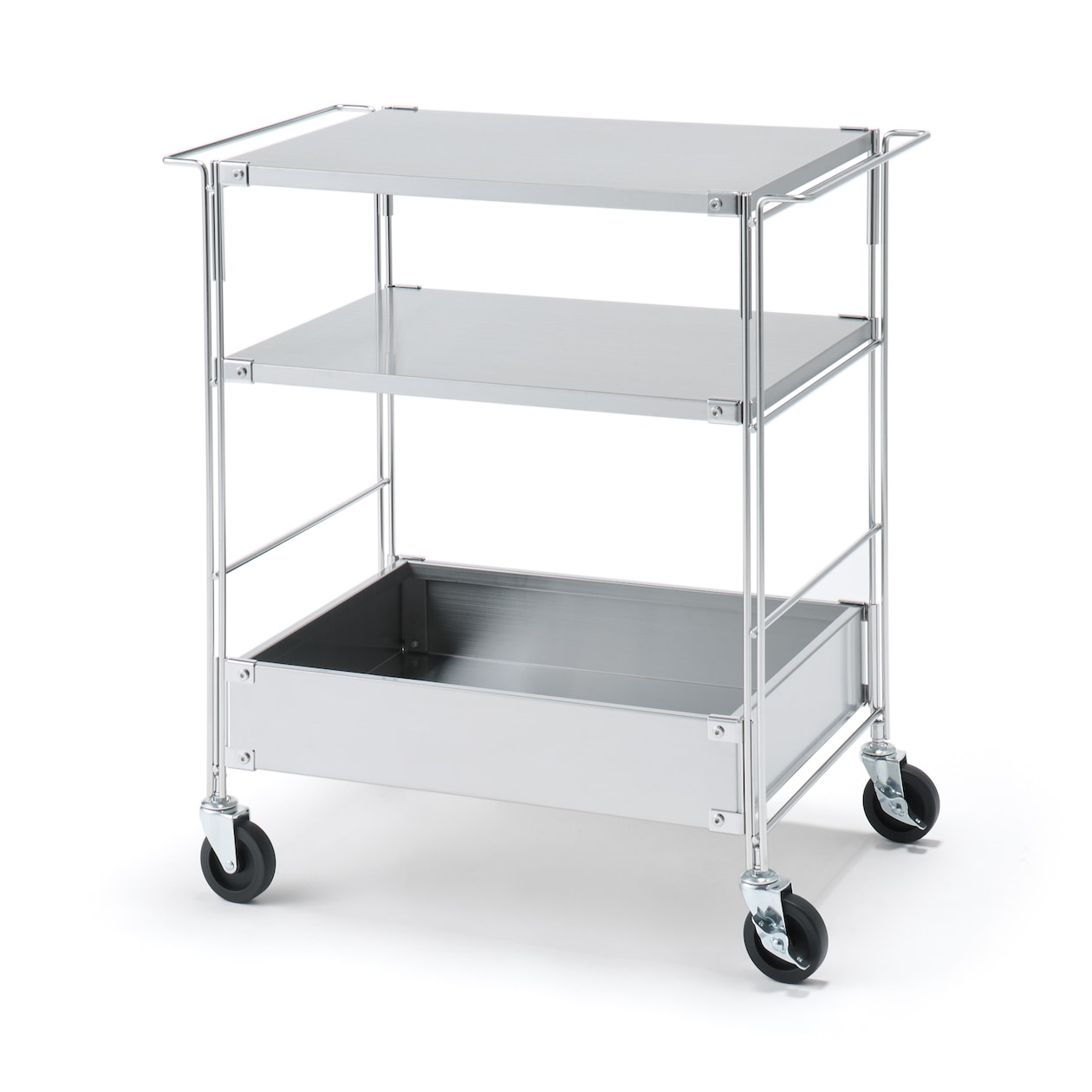 棚板、箱タイプのトレー棚板を組み込んだステンレスユニットシェルフのワゴンセットです。各棚の位置を変えて使用しないでください。強度が弱まり、本体が破損する原因となります。