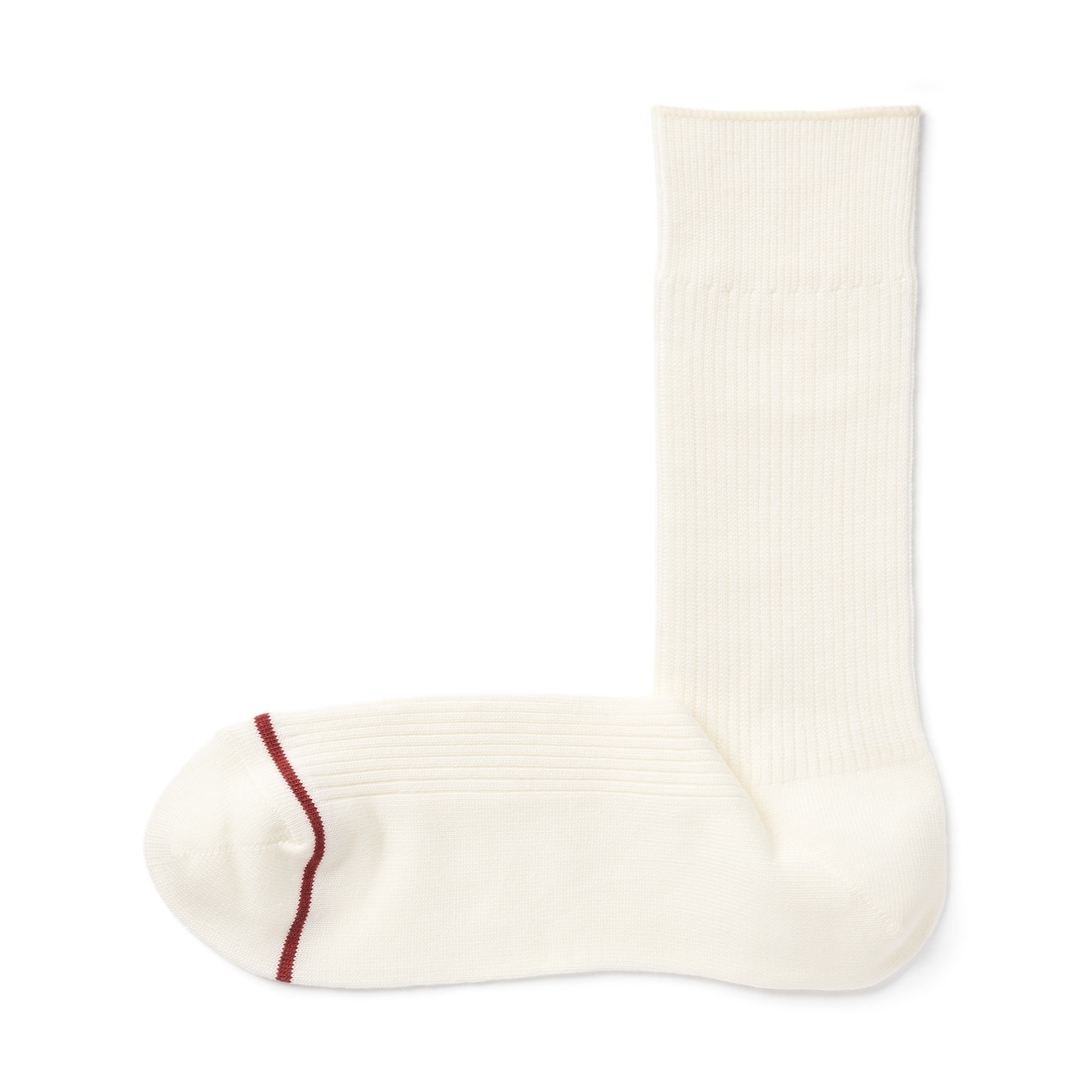 吸湿発熱性のある綿と、ウールを使い、踵に合わせて直角に編み立てました。汗の臭いを抑制します。綿はオーガニックコットンです。クローゼットに収納した後も識別できるよう、つま先にラインを入れました。