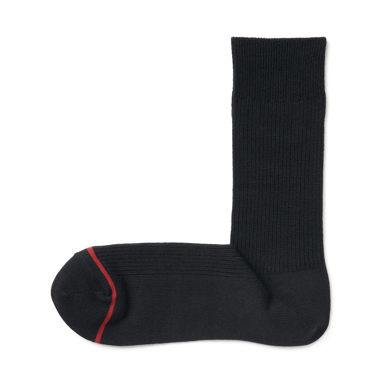 吸湿発熱性のある綿と、ウールを使い、踵に合わせて直角に編み立てました。汗の臭いを抑制します。綿はオーガニックコットンです。クローゼットに収納した後も識別できるよう、つま先にラインを入れました。