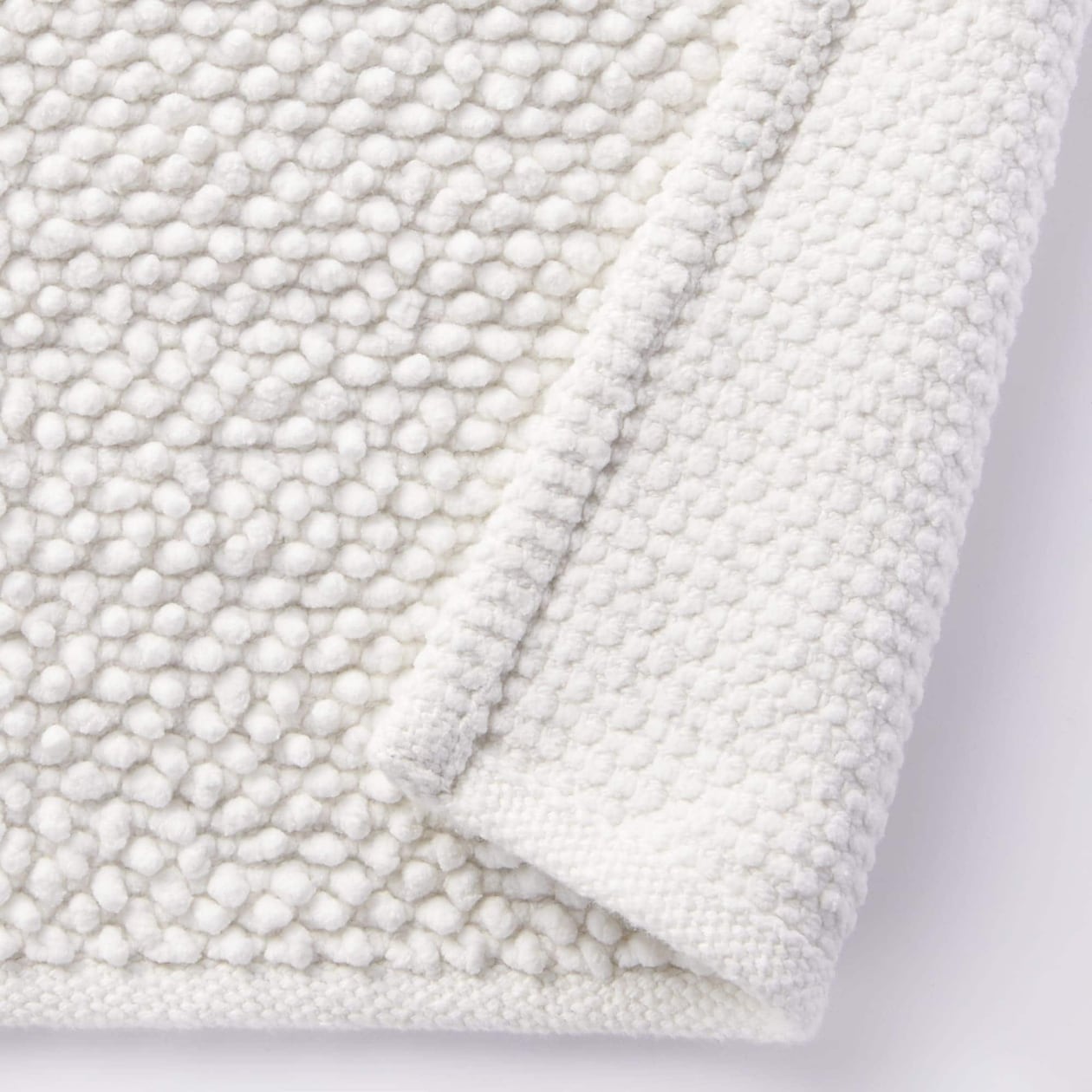 飾り糸の一種で、モール糸などとも呼ばれ、ビロード状にけば立っているのが特長のシェニール糸を使っています。_綿のシェニール糸をループ状に手で巻きあげて作った手織りのバスマットです。踏むたびに足裏に心地よい凹凸感と綿の自然な肌触り、吸水性が特長です。綿はオーガニックコットンです。