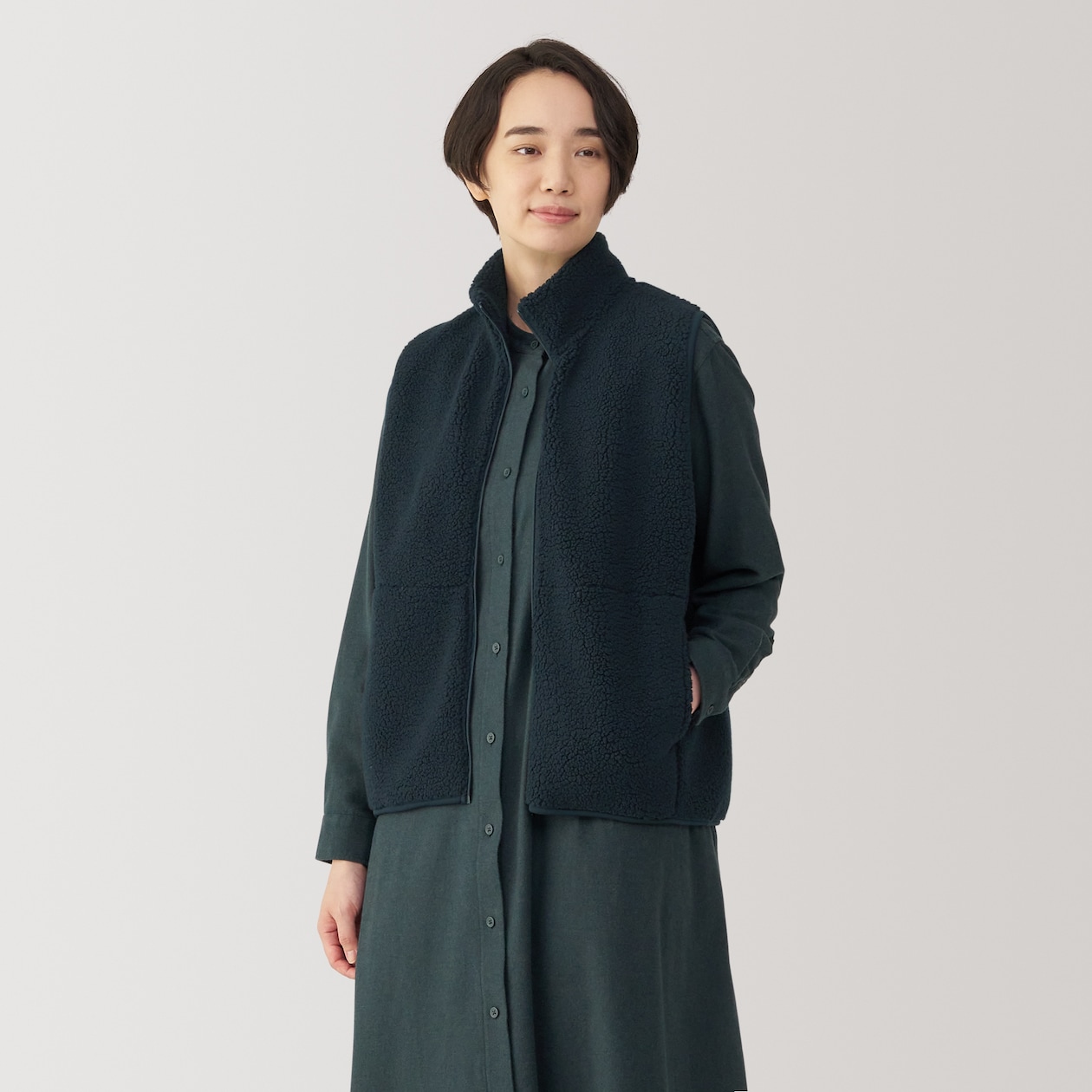 ペットボトルを再利用した再生ポリエステル100%の素材です。表面は伸縮性があり、やわらかな着心地のボアフリース、裏面は毛足の短いマイクロフリースにすることで袖通しがスムーズでごわつきを気にせず着ることができます。