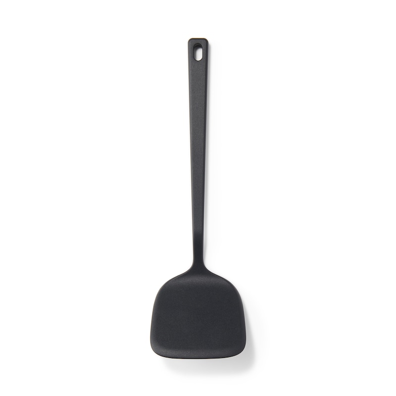 耐熱温度の高いシリコーン素材を使った、食材を受け止めやすく、返しやすいターナーです。鍋やフライパンを傷つけにくく、色は食材による色移りが目立ちにくいよう黒色にしています。