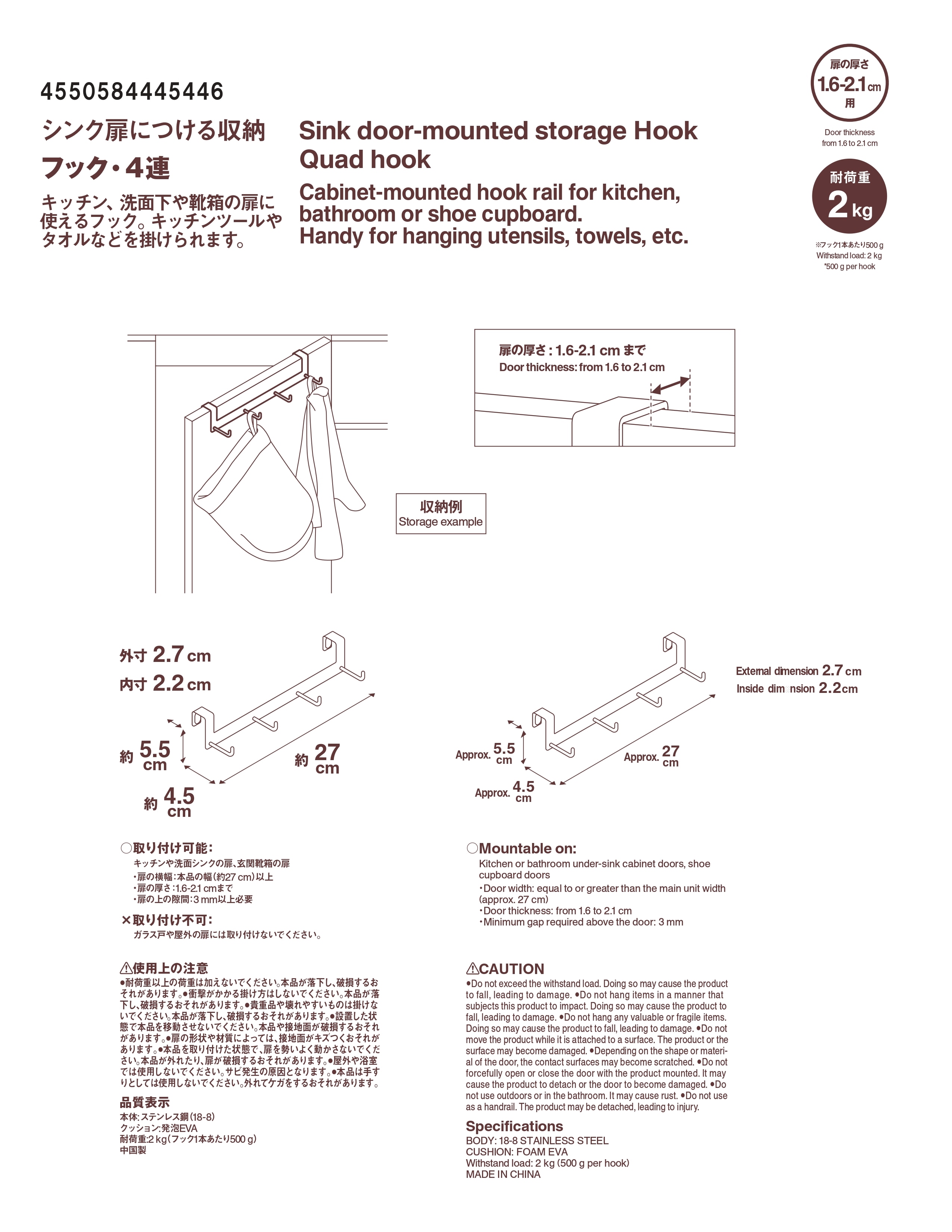 キッチン、洗面下や靴箱の扉に掛けて使えるフック。タオルやくつべらなどを掛けられます。