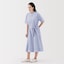前あき仕様のシャツワンピースで、一枚での着用はもちろん、羽織りとしてもおすすめです。Aラインシルエットのデザインですが、ウエストリボンが付いており、リボンを結ぶことで異なる印象を楽しむことができます。後ろに大きなタックを施し、風通しが良く、涼しい着心地です。