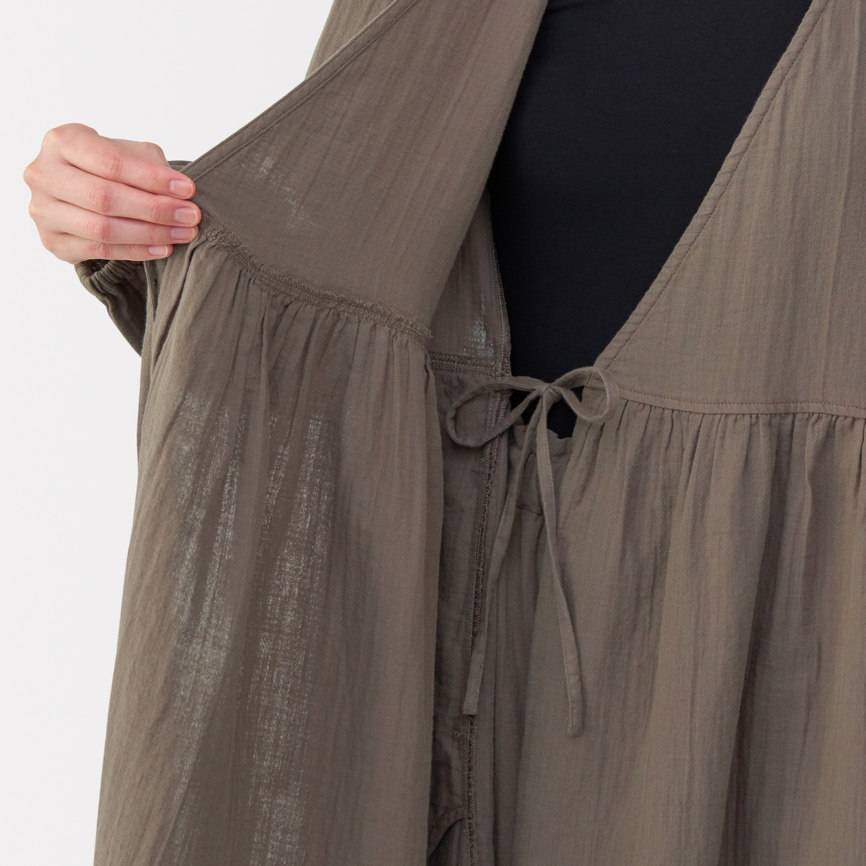 羽織としてもワンピースとしても着られる2WAY仕様のルームウェアです。カシュクールデザインが身体をやさしく包み込み、リラックスした時間にも、ちょっとした外出にも活躍します。袖口にはゴムが入っているので、腕まくりがしやすく便利。やわらかな素材で素肌にも心地よく、動きやすいので日常使いにぴったりな一着です。
