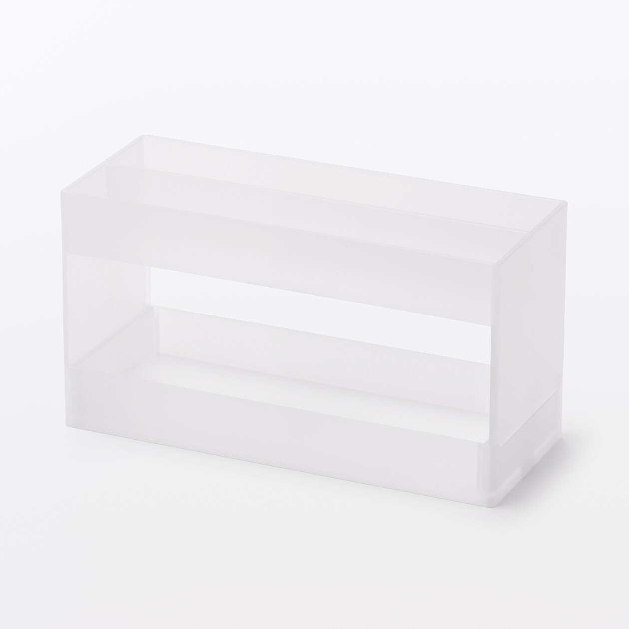 単独でも組み合わせても使える、半透明のメイクボックス用スタンド。メイクパレットやチューブなどを収納するのに便利です。再生材を20%使用しています。
