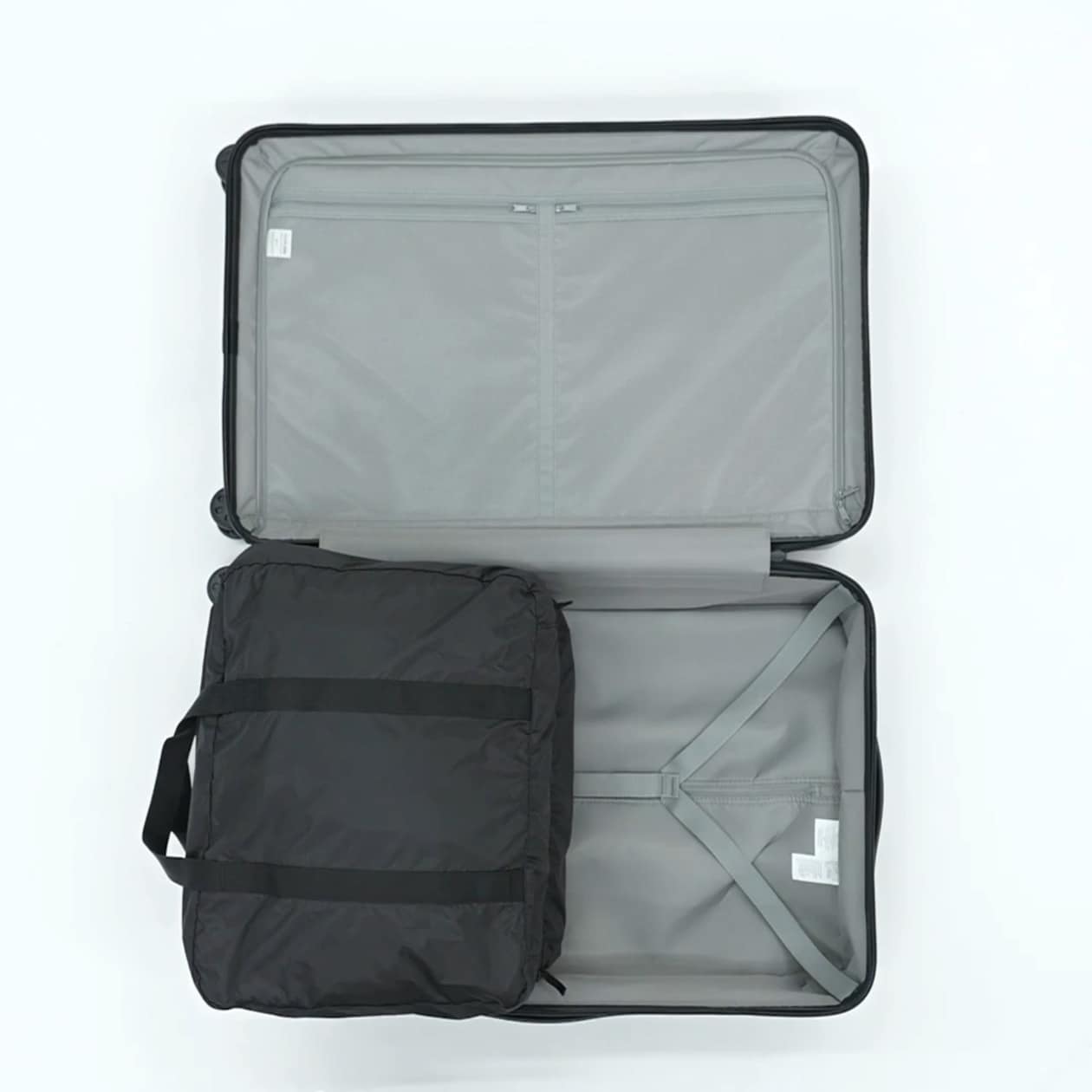 小さくたためるボストンバッグです。広げると75Lの無印良品のハードキャリーケースの片側にピッタリ収まるサイズです。旅に行くときは仕分けケースとして。荷物が多くなる帰り道はボストンバッグとして使えます。キャリーケースにセットアップ出来るベルト付きです。生地には再生素材を使用し、一部に撥水加工を施しました。