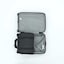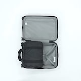 小さくたためるボストンバッグです。広げると36Lの無印良品のハードキャリーケースの片側にピッタリ収まるサイズです。旅に行くときは仕分けケースとして。荷物が多くなる帰り道はボストンバッグとして使えます。キャリーケースにセットアップ出来るベルト付きです。生地には再生素材を使用し、一部に撥水加工を施しました。