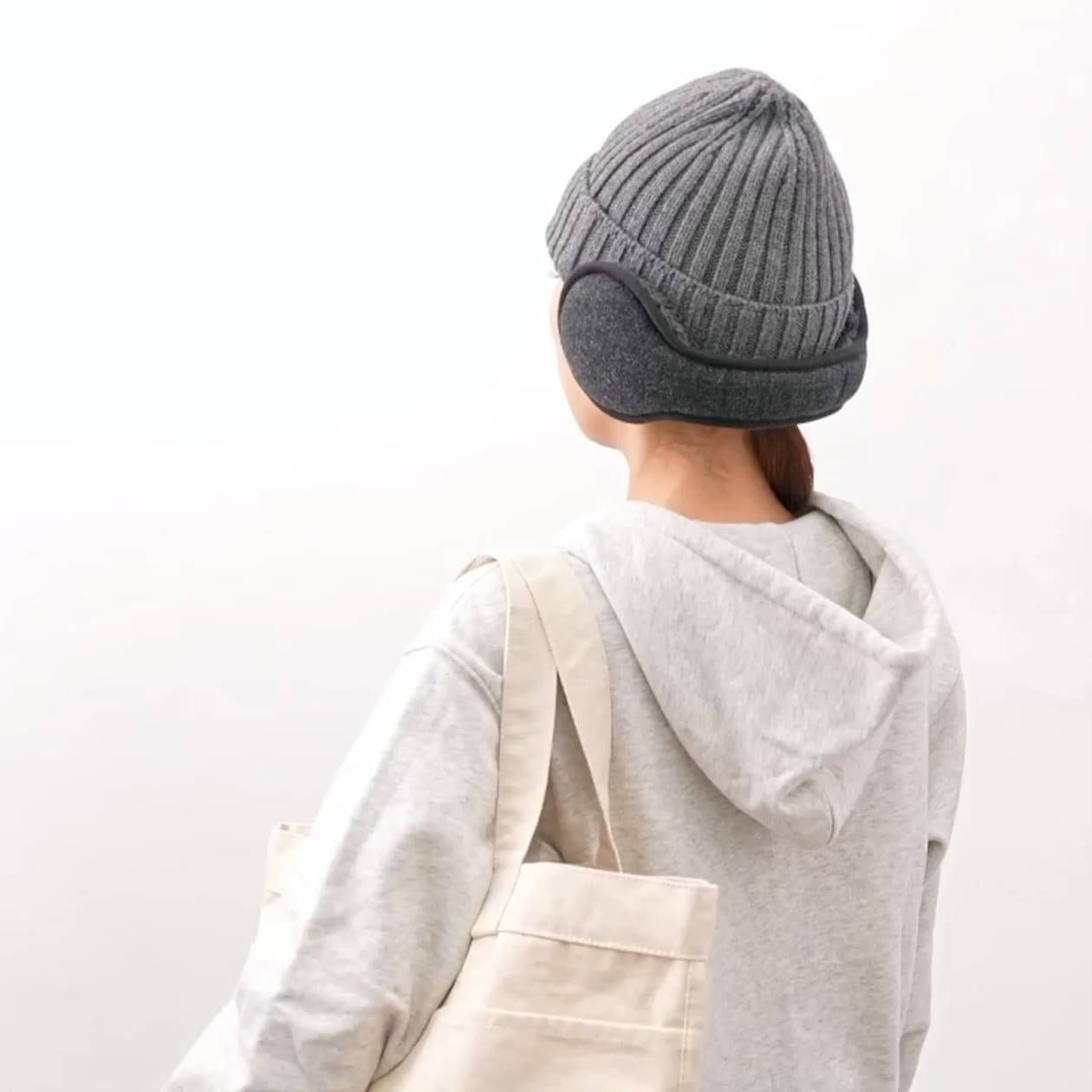 後ろからつけるので、髪型が崩れにくく、帽子とも併用できます。サイズ調整ができます。