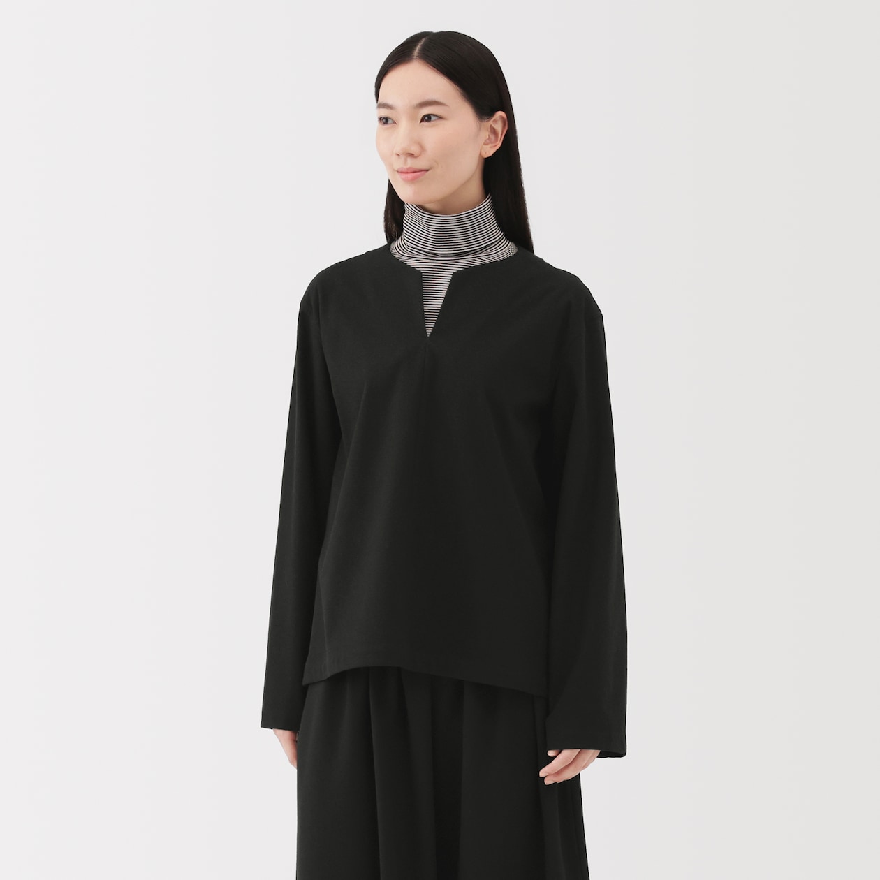 【素材】 布帛のような見た目のカットソー素材を使用しています。ストレッチ性がありながら、型崩れしにくいのが特長です。毛玉ができにくいよう生地を見直し、着心地良く仕上げました。 【デザイン】 プルオン仕様の長袖ブラウスです。衿ぐりはキーネックになっており、インナーを見せてもすっきりと着こなせます。少しルーズなシルエットで、日常使いもしやすいデザインです。 【仕様】 透け感:なし 伸縮性:あり フィット感:普通 【こちらもおすすめ】 同素材の「カーディガン」もおすすめです。
