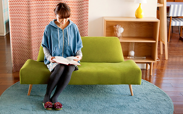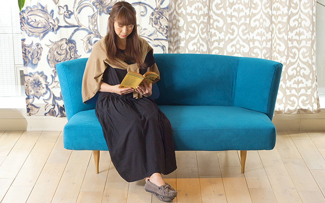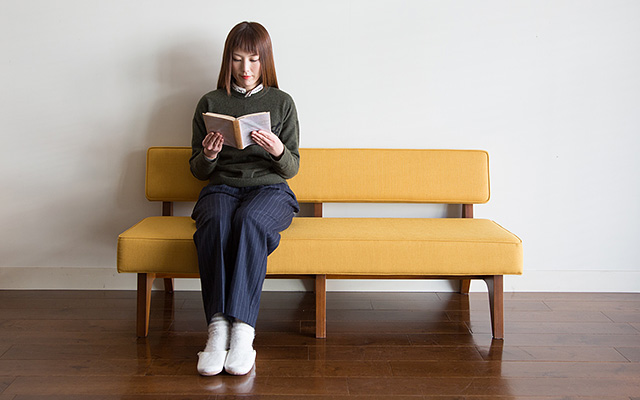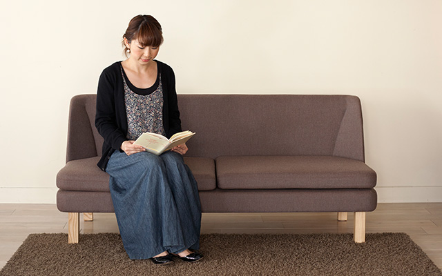 身長165cmの女性が座ったところです。インテリアに取り入れやすいコンパクトサイズですが、大人の女性が3人座れるくらいの幅があります。