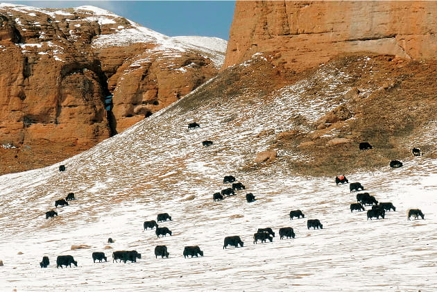 チベット高原の厳しい寒さから身を守る、ヤクのやわらかいうぶ毛を使って無漂白で仕上げました。繊維の中に空気が保存できる構造があり保湿性が高く、摩擦に強いため毛玉になりにくいのが特長です。