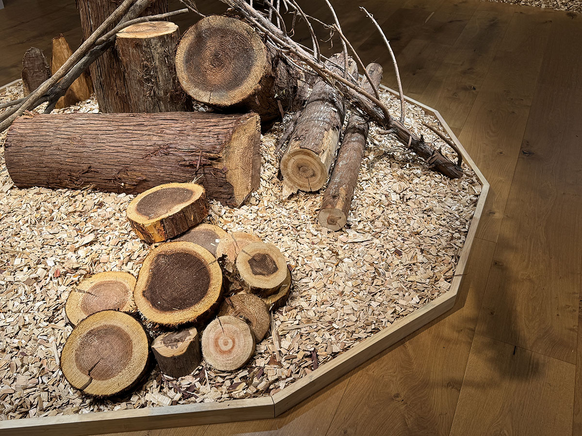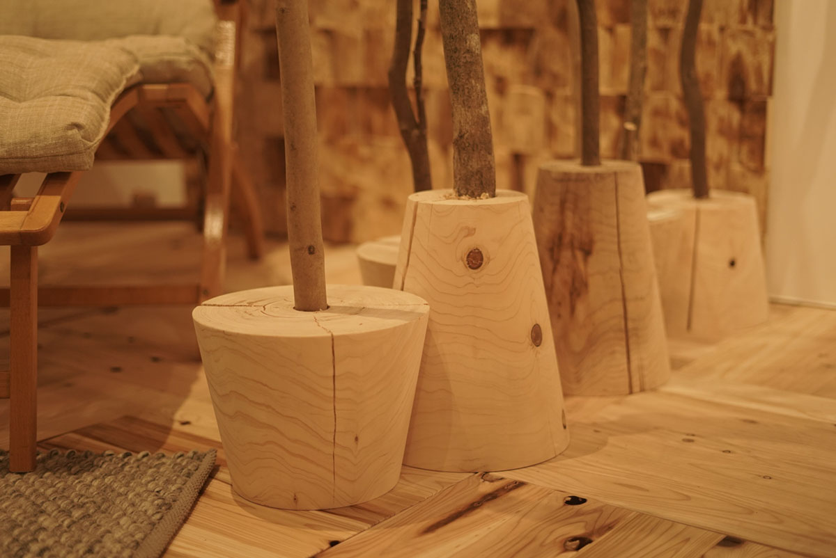 山のダイゴミプロジェクトから生まれた「山の木っ端」をつかい、できるだけ工程を省くことで森や木のぬくもりを感じられる家具や照明を考えました。私たちは、素材を余すことなく活用するために、これらを空間提案に積極的に取り入れることを目指します。
